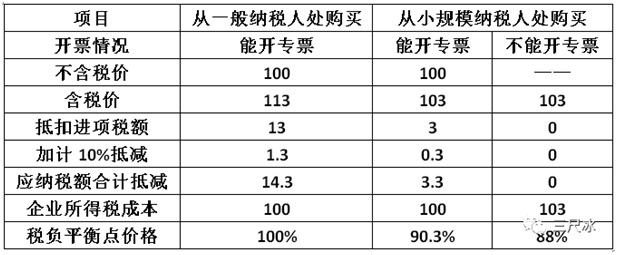 結(jié)論:在能取得增值稅專用發(fā)票的情況下,小規(guī)模納稅人的含稅價(jià)應(yīng)該比一般納稅人便宜6.6元(價(jià)格為一般納稅人價(jià)格的93.9%);價(jià)格高于93.9%,從一般納稅人處購買更合算,反則反之。如果小規(guī)模納稅人不能開專票,小規(guī)模納稅人的含稅價(jià)應(yīng)該比一般納稅人便宜9.15元(價(jià)格為一般納稅人價(jià)格的91.6%);價(jià)格高于91.6%,從一般納稅人處購買更合算,反則反之。